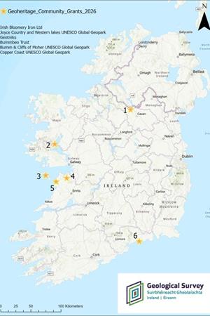 With the 2026 grant funding, Geological Survey Ireland has awarded Geoheritage grants to six community-based projects around the country. These grants will support the development and publication of educational and outreach materials by local groups, established geotourism sites, aspiring geoparks and UNESCO Global Geoparks. The aim of the fund is to encourage the telling of the Irish geological story, improve the understanding of geoscience, and to engage with groups throughout the country.